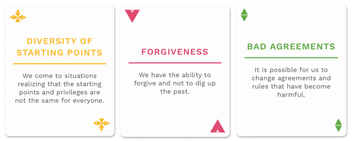 Agreements. Agreements are important because if we go only on hunch and feelings – empathy, sympathy, or compassion – equality and parity will not necessarily be strengthened for everyone. Maybe I’ll give privileges to those I like more or are sweet guys for some reason. It would always be good to have someone with a value base, and I think agreements are a common value base in this deck: there are cards like justice, equality, dialogue skills, for example.
