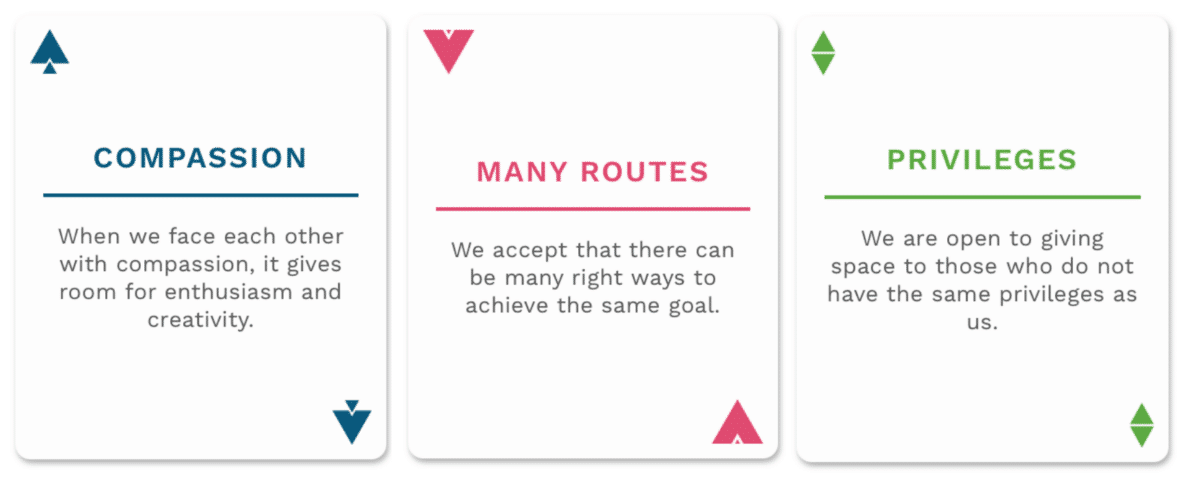 I tested with a group of players who were completely foreign to each other, all of whom were somehow aware of the themes of equality and non-discrimination. One test player commented eloquently “ these cards would be good for everyone in working life to deal with, these are the skills of being human ”. At best, I think this is for a group that is united by work or hobby, i.e. they are somehow the same group.