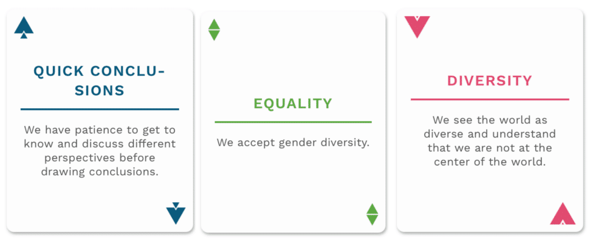 We played Topaasia games at work, and while browsing the selection of decks, I noticed that there was not a game specifically discussing about equality at work. I think many of those who play Topaasia are teams in the workforce, and I think there is a need for a more open, bold debate on the themes of equality and parity in the workplace. This is where the idea came from: I thought this could improve people’s skills or the skills of being together in working life and thereby potentially prevent conflicts.