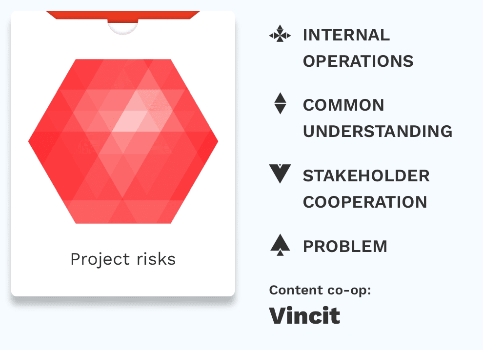 Topaasia has done several game decks with Vincit to support team’s operations and business: Retrospective, Successful Project, Business Development, Purpose, and most recently Project Risks, designed to help project members discuss the risk factors affecting the project. The contents of the deck are compiled from the most likely risk factors for projects identified by Vincit in their internal research.