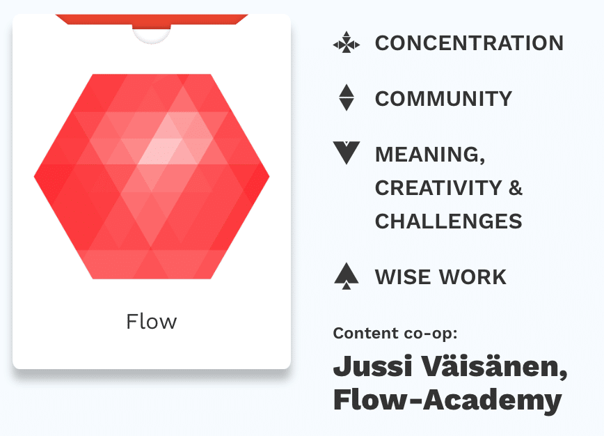 Together with Jussi Venäläinen, we made a Topaasia deck called “Flow” in Topaasia for everyone interested to try, which focuses on the conditions of Flow in the work community.