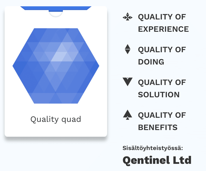The base as a frame of reference for the game, i.e. the suites of the deck, was taken from the Quality Quad, which is the method of Qentinel. It was developed for discussions with customers and stakeholders when starting projects and larger investments. The method has served us and our customers very well.