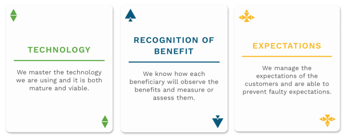 Quality of the solution is the suite clearly the “dullest” of the deck. It is probably because it is the clearest and corresponds to what is usually thought of when it comes to quality. The second most commonly thought the quality of doing. This is because the factor can directly affect the quality of the solution. The quality of benefits and experience can only be indirectly affected by the factor through the solution.