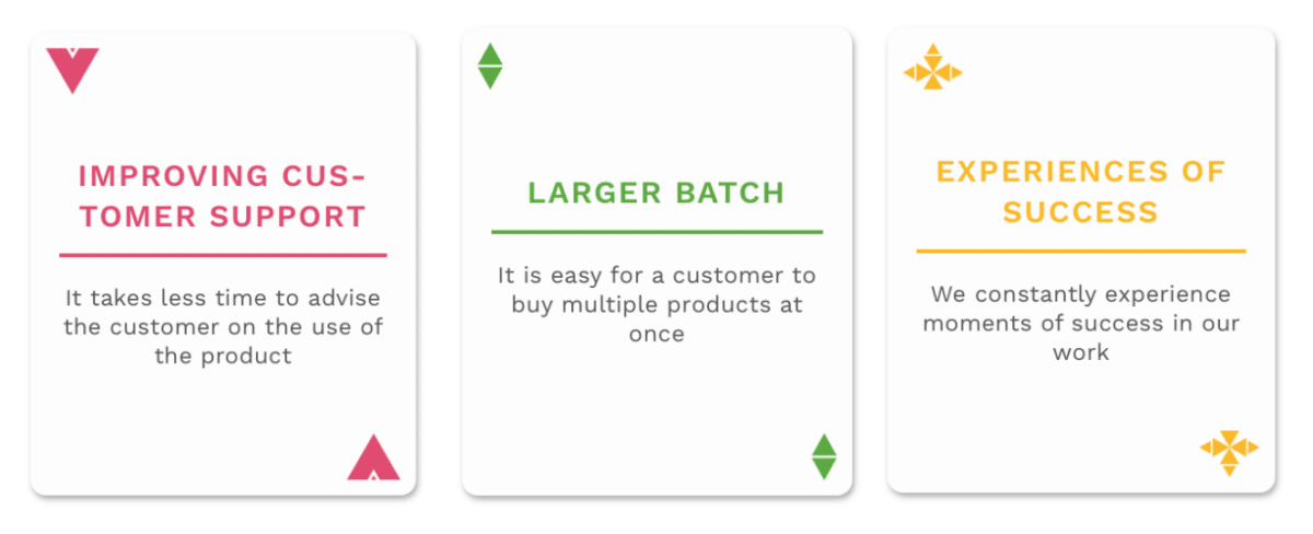 The most interesting suite in the deck is definitely the “employee experience”. “Customer experience,” “additional sales,” and “streamlining work” are fairly familiar themes for many organizations, and the cards most familiar to many players can be found in them. Looking at value from the perspective of yourself or an employee of a customer organization gives a whole new, more humane lens to your own product / service.