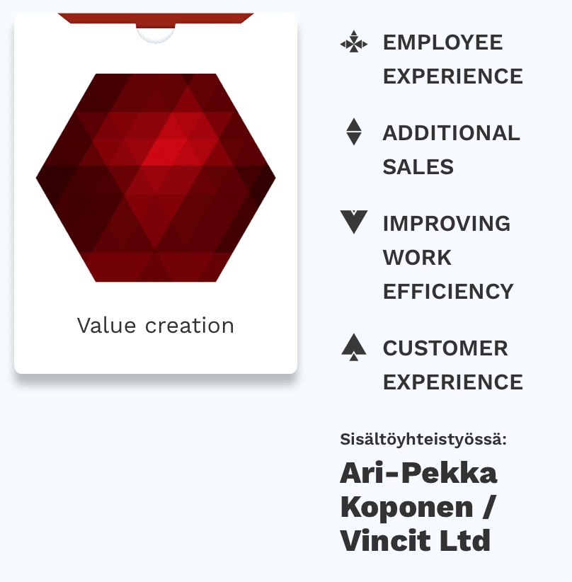 The newest member of the Topaasia® deck family is Value Creation, which was made together with Vincit’s Ari-Pekka Koponen. Value Creation – Deck helps companies and Teams understand the value of the product or service they offer. It is useful when creating or launching a new product or wanting to find new perspectives on an existing product / service. For example, the deck can be used to clarify a promise of value, sales arguments, or the importance of your own organization on creating value for others.