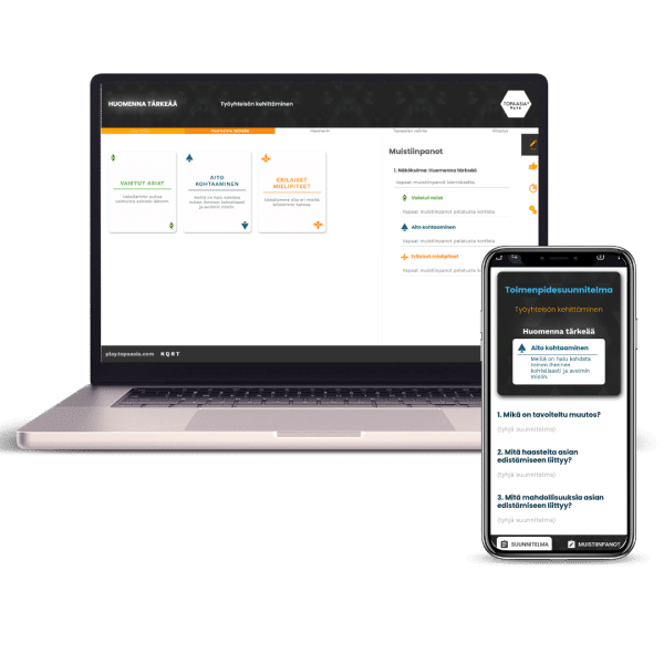 • Toimintatapojen kehittämiseen: Keskustelukorttien avulla tiimit voivat analysoida omia toimintatapojaan ja löytää parannusmahdollisuuksia. Näin jokainen tiimin jäsen voi tuoda esiin omia näkemyksiään tiimin toiminnasta.